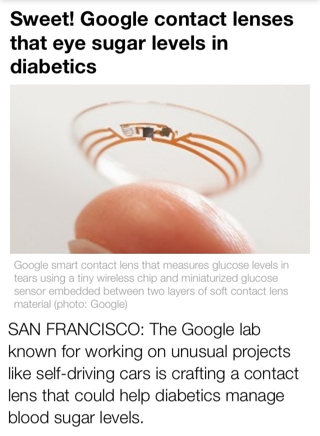 Google is working on a contact lens that’s built to measure glucose levels in the tears. Self monitoring of blood glucose is an important part of diabetes management especially in insulin treated patient. However the only way to do this currently remains via finger prick. If this contact lens technology becomes a reality it will provide an additional helpful option for patients with diabetes to monitor their sugar.